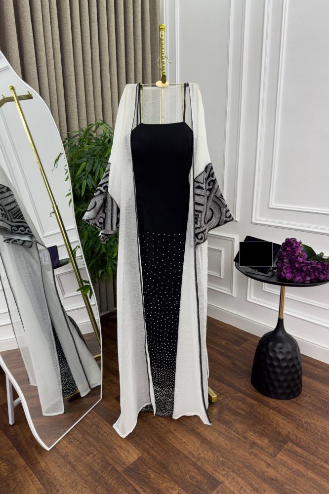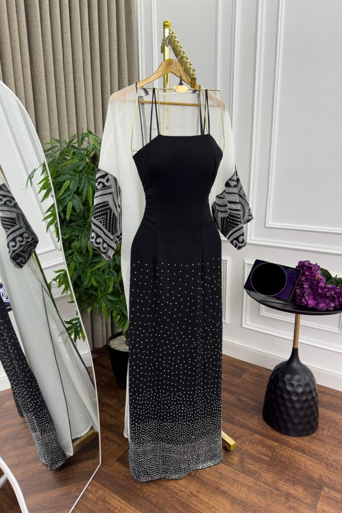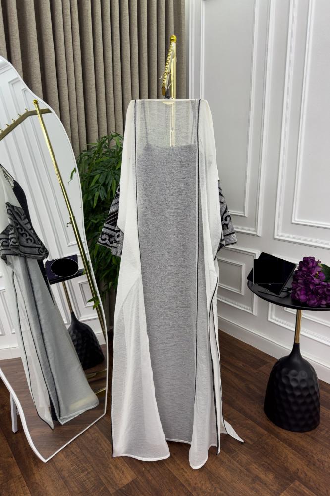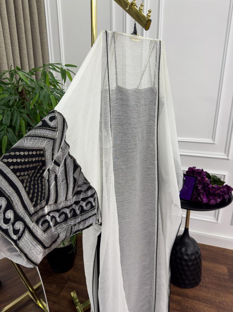 ✨ الألوان والتفاصيل: الجلابية تأتي بلون أسود أنيق مع لمسات بيضاء راقية، مما يخلق تباينًا جذابًا ومثاليًا للمناسبات. الأكمام تتميز بتطريزات أنيقة ذات طابع شرقي فاخر، مما يجعلها خيارًا مثاليًا لجلابيات المناسبات وجلابيات العيد الفاخرة.