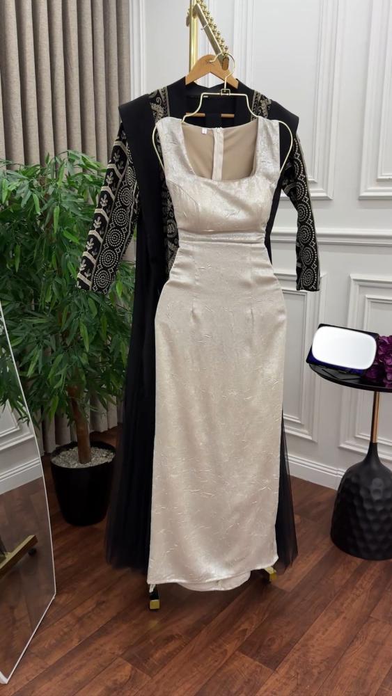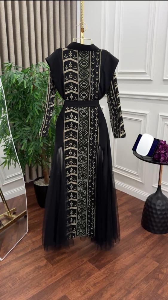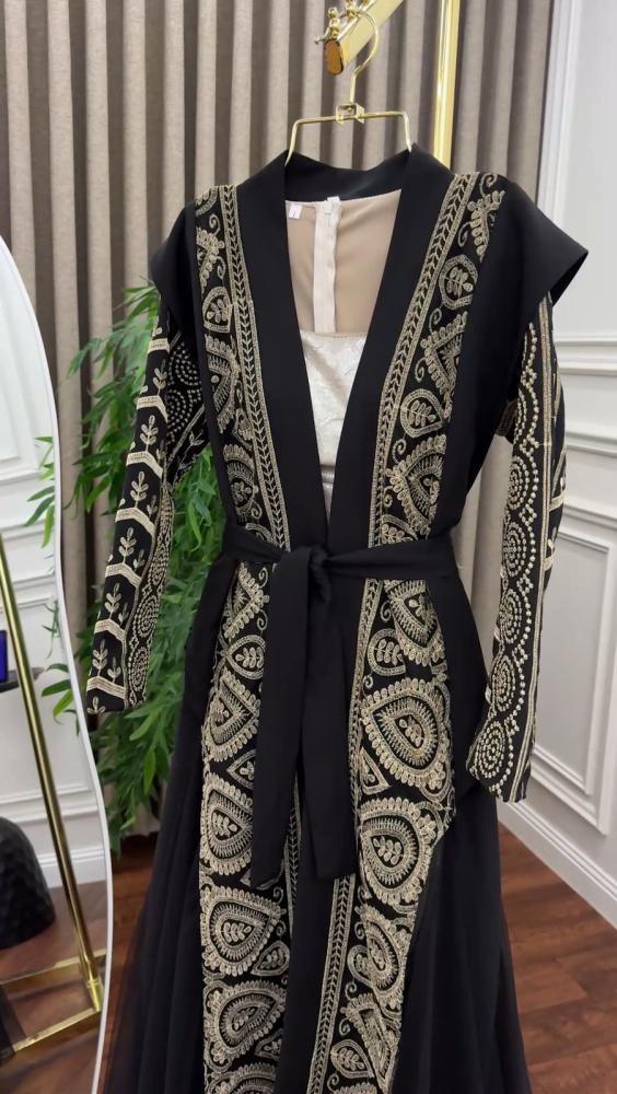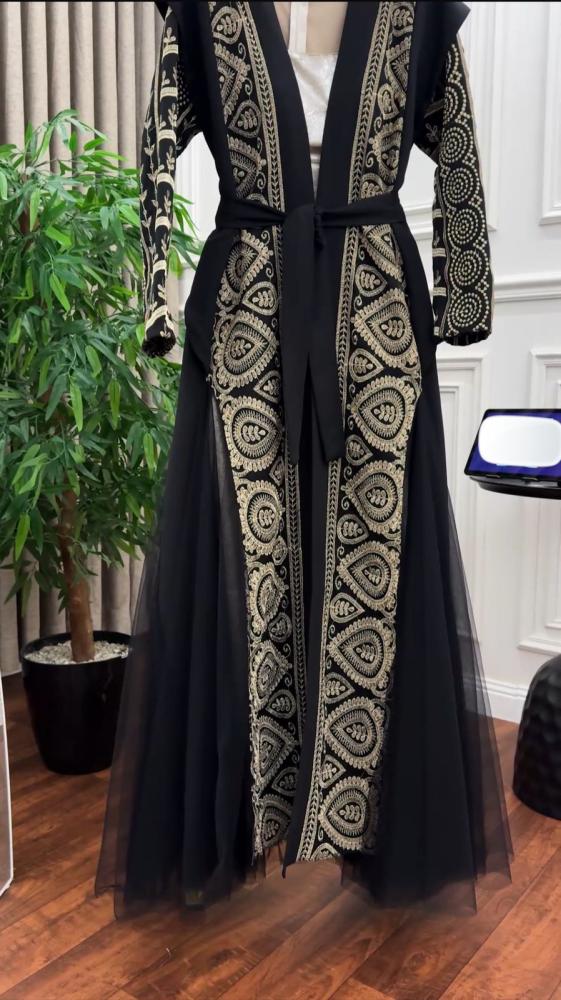 تتميز هذه الجلابية بتصميم أنيق يجمع بين الفخامة والأنوثة، مما يجعلها خيارًا مثاليًا للسهرات الفاخرة والمناسبات الخاصة. تتكون من قطعتين متكاملتين، حيث يجمع الفستان الداخلي بين البساطة والرقي، بينما تضيف العباية الخارجية لمسة من الفخامة الشرقية بفضل تطريزها الذهبي الفاخر.