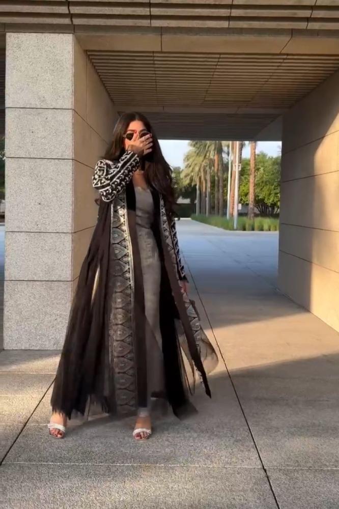 - الجزء السفلي مصنوع من قماش التُل الشفاف، ما يمنح العباية مظهرًا ملكيًا ناعمًا وانسيابيًا مع كل حركة.