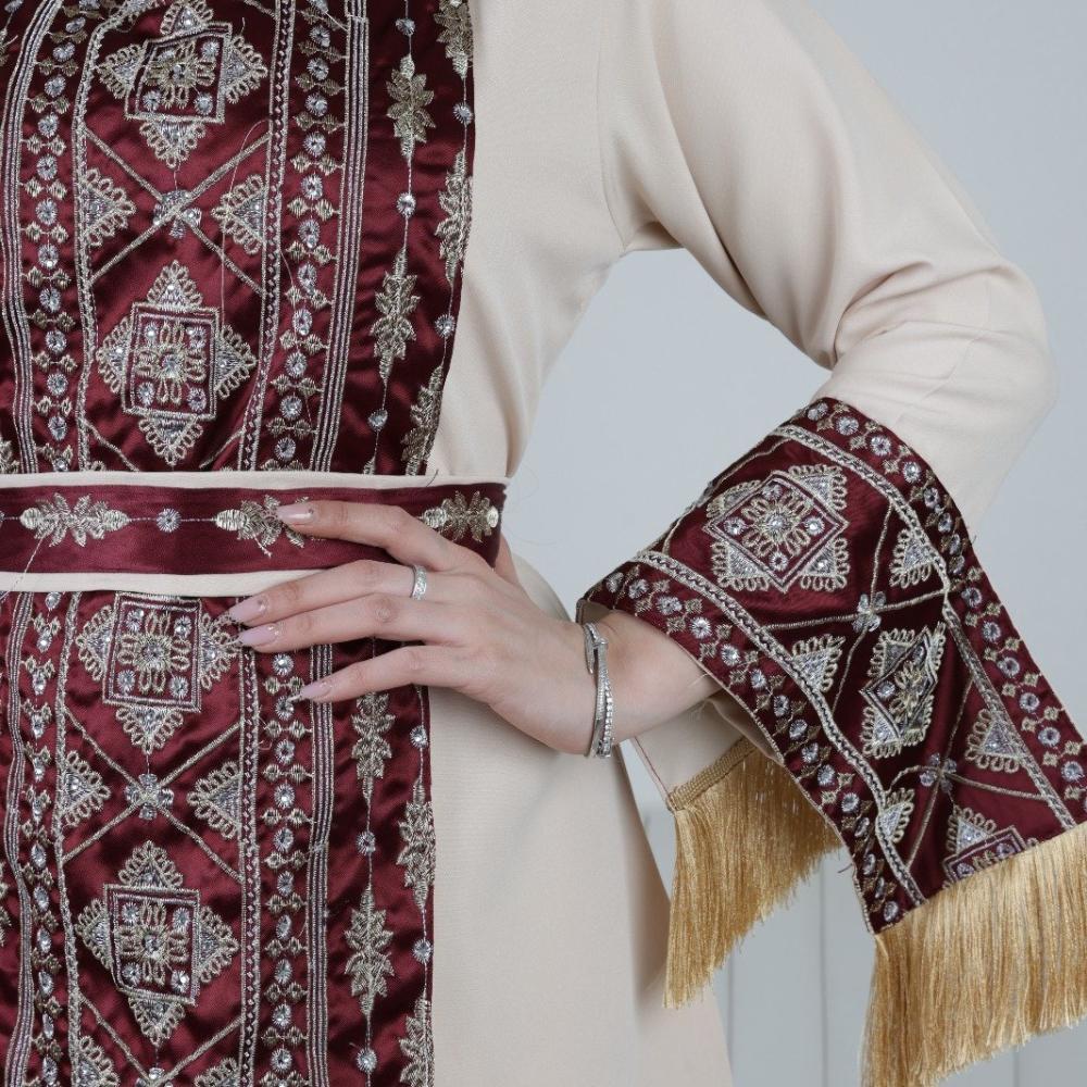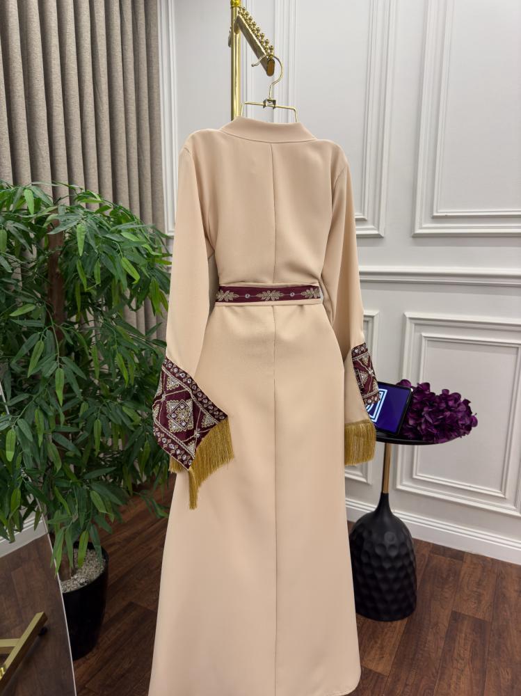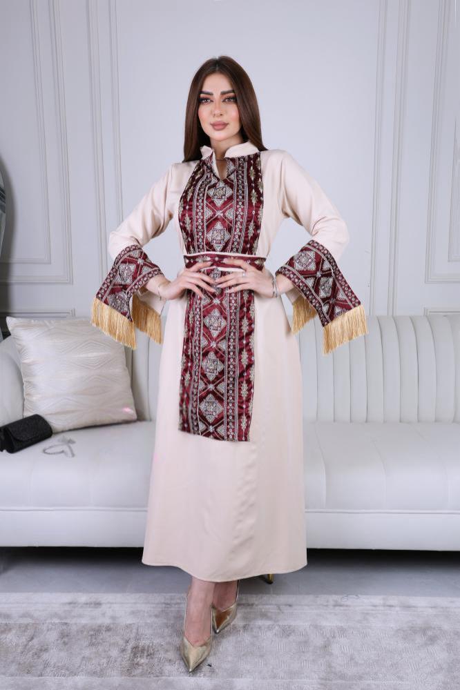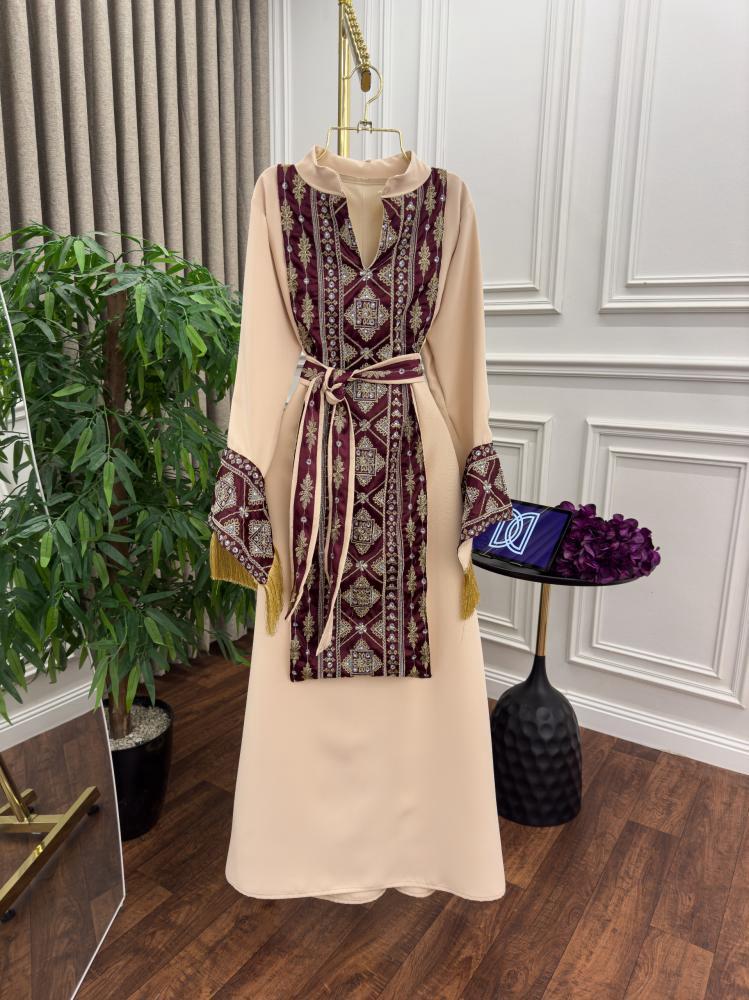تأتي هذه الجلابية بلون بيج كلاسيكي ناعم يعكس الأنوثة والرقي، مما يجعلها مناسبة لجميع المناسبات الراقية. يتوسطها تطريز فاخر مستوحى من النقوش التراثية العريقة بلون خمري أنيق، ما يمنحها طابعًا مميزًا يجمع بين العصرية والتقاليد.