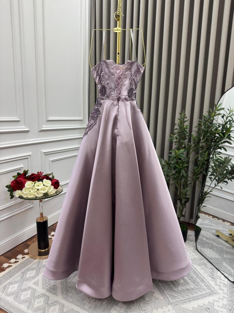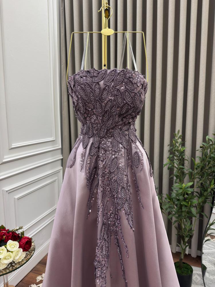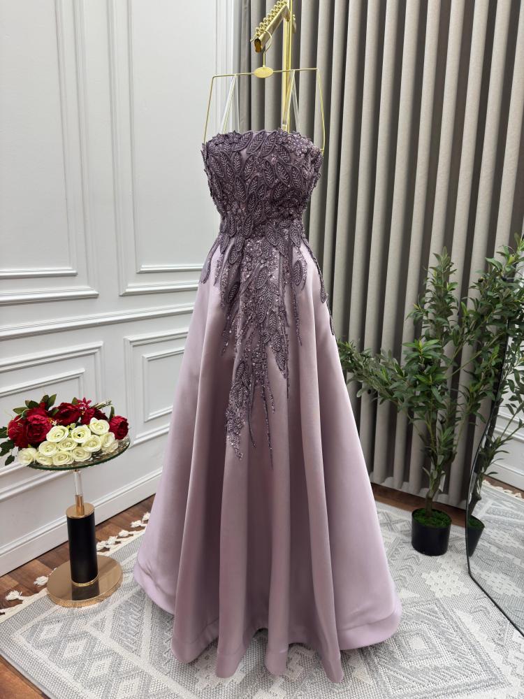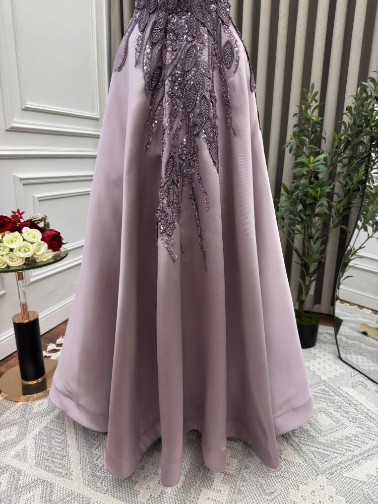 - اللون: بدرجة أنيقة من البنفسجي الفاتح (Lilac) مما يجعله مناسباً للمناسبات الفخمة مثل السهرات وحفلات الزفاف.