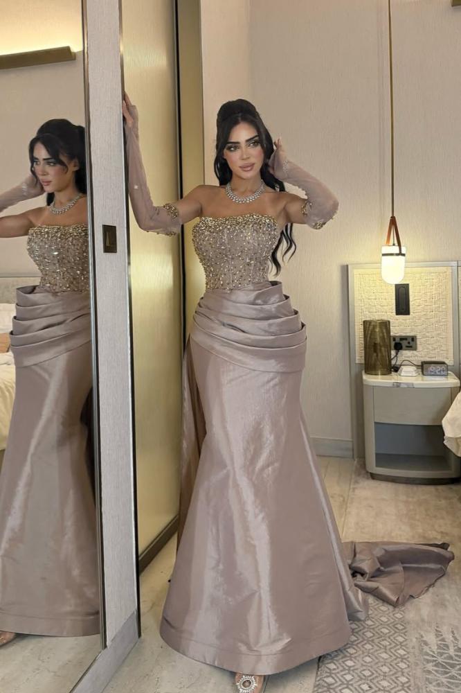 فستان سهرة ملكي لون بيج داكن بتصميم حورية