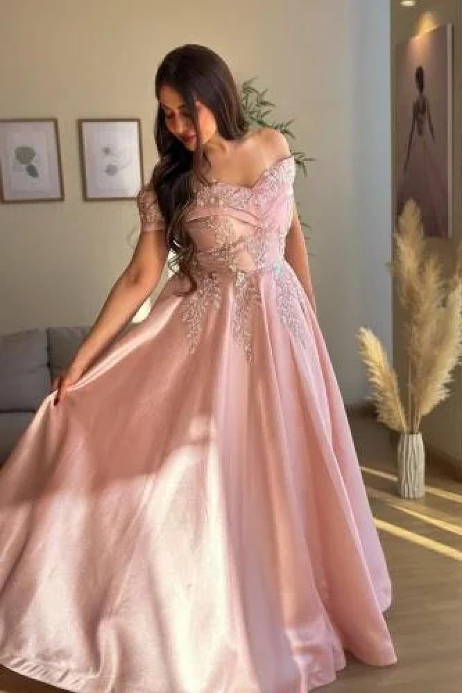 👗 فستان سهرة وردي من خامة تفتة روسي بتطريز فاخر – تصميم ملكي ناعم
