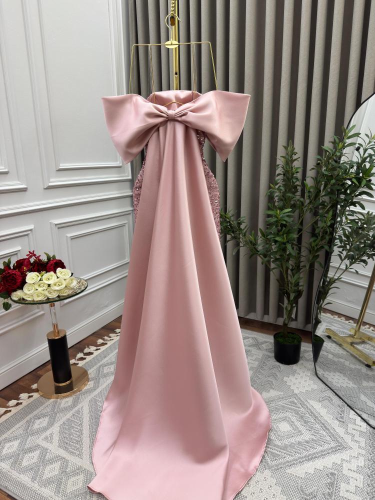 التنورة والتفاصيل الخلفية: الفستان مزود بذيل طويل فاخر يمتد من الخلف، مما يمنحك إطلالة ملكية مبهرة عند المشي.