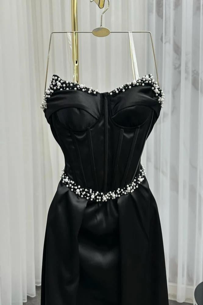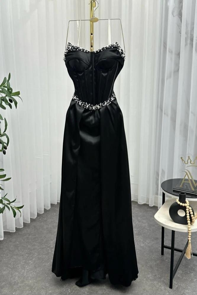 فستان سهرة أسود حرير بتطريز يدوي فاخر