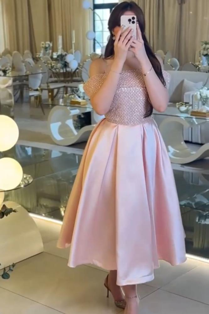 - يتميز بتصميم أوف شولدر (Off Shoulder) يعانق الكتفين برقة، ويُضفي لمسة أنثوية ناعمة.