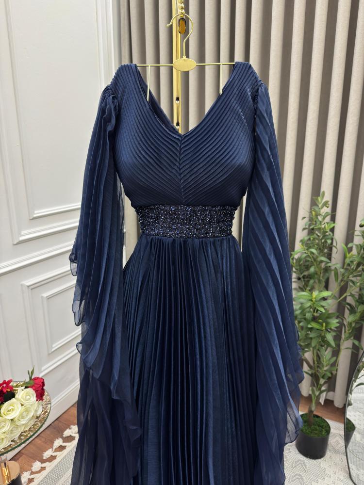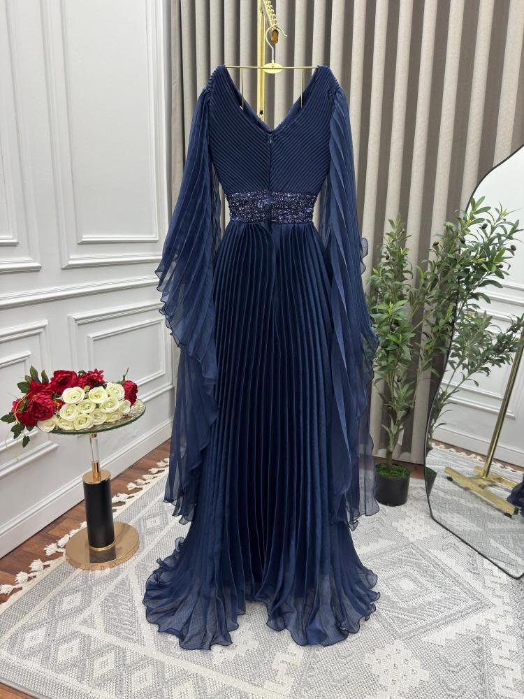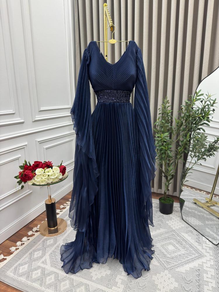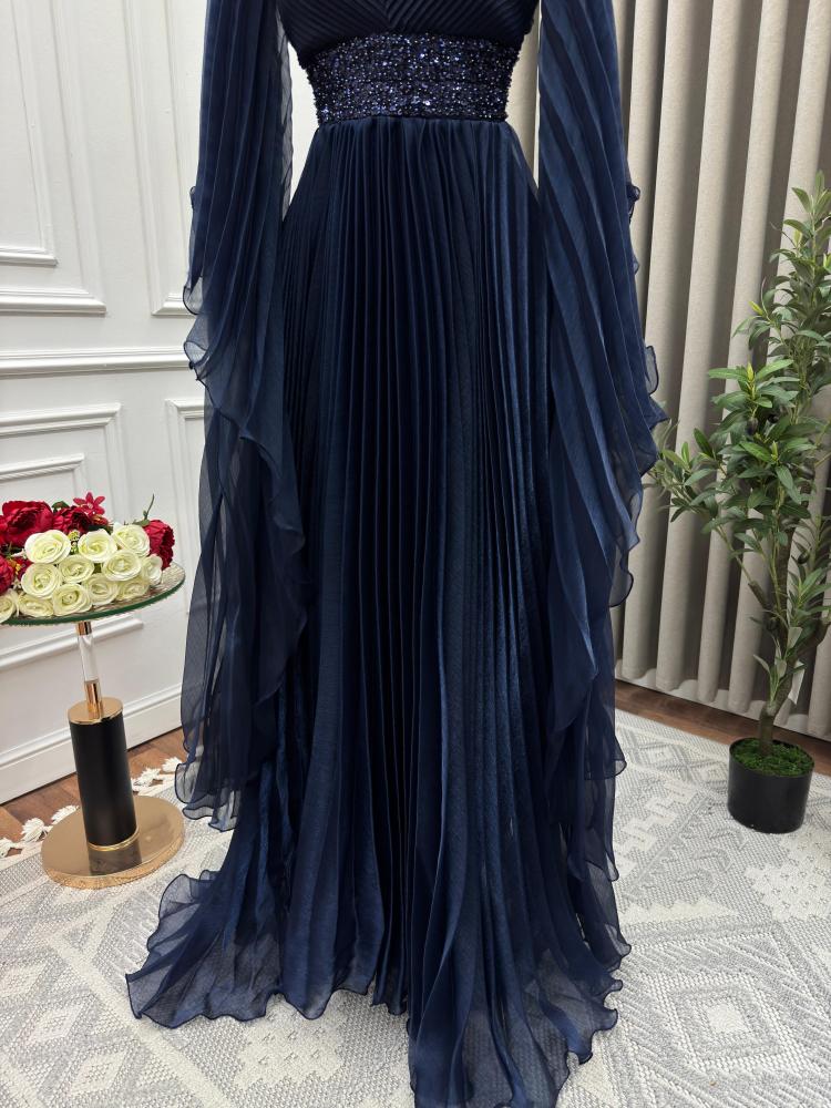 فستان سهرة فخم بلون كحلي وأكمام منسدلة