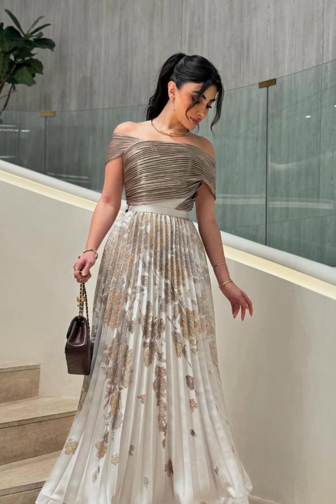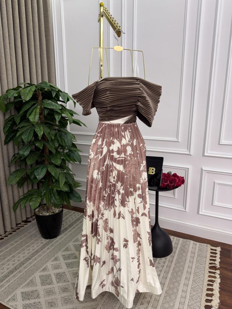 الفستان يجمع بين لون بني شوكولاتة غامق في الجزء العلوي، مع تدرج لوني إلى البيج الكريمي المطبوع بالزهور في الأسفل، ما يجعله متناسقًا مع جميع ألوان البشرة ويضفي لمسة طبيعية راقية.