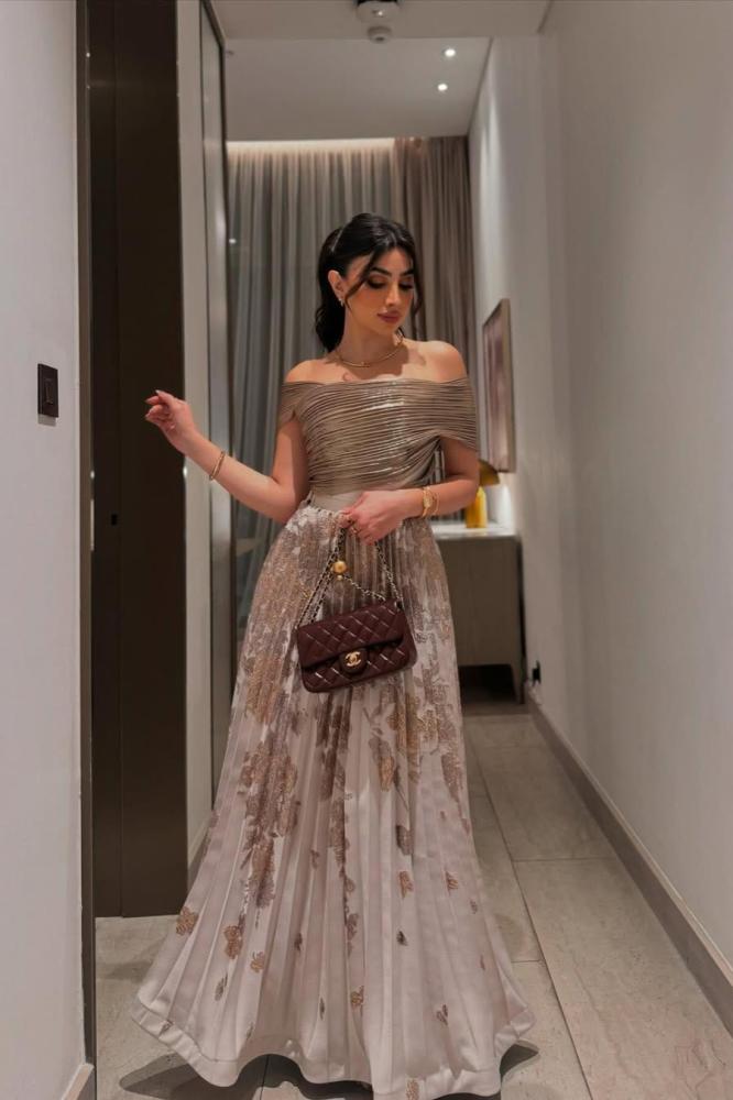 - الطول: طويل ليلامس الأرض بأناقة، مثالي للسهرات والمناسبات الراقية.