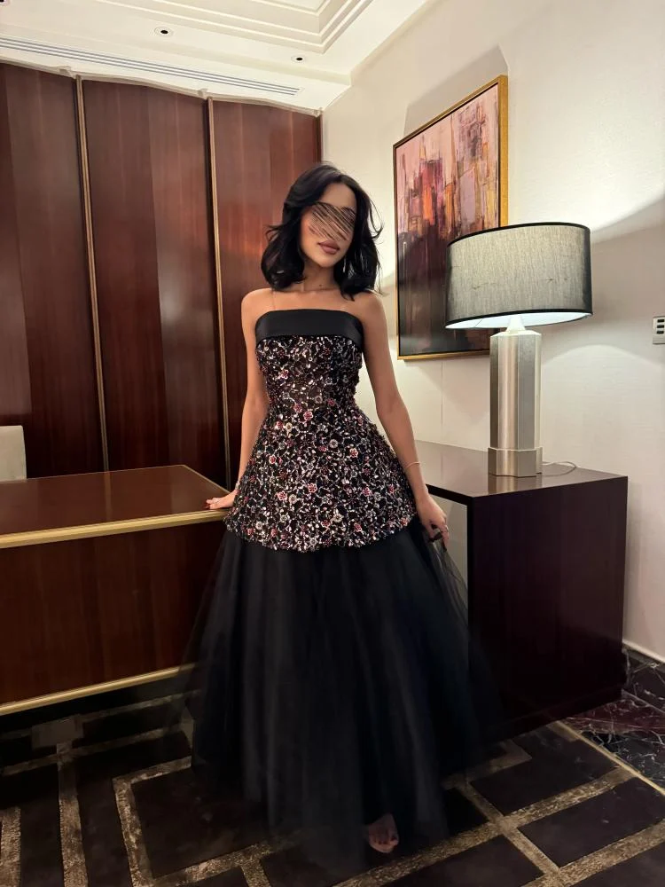 ✨👗 وصف فستان سهرة أسود بتطريز وردي وتنورة تول – لمسة ناعمة بإطلالة ملكية 👗✨
