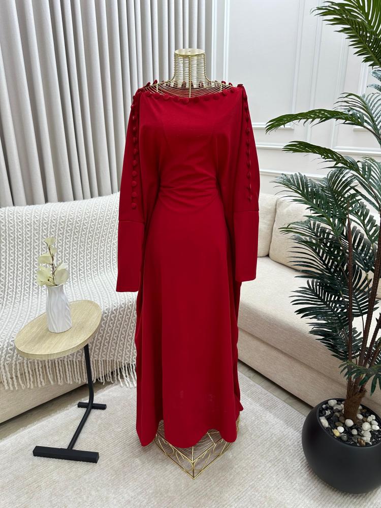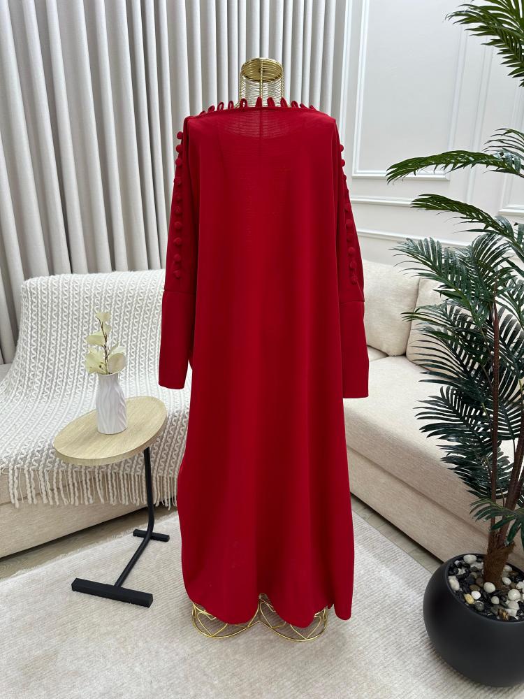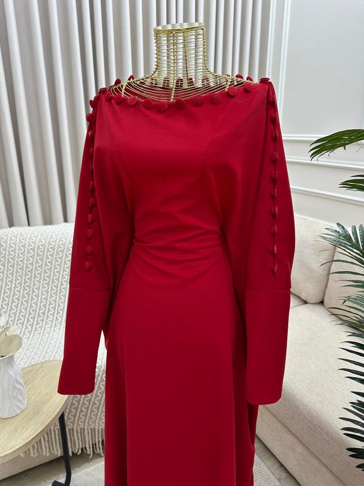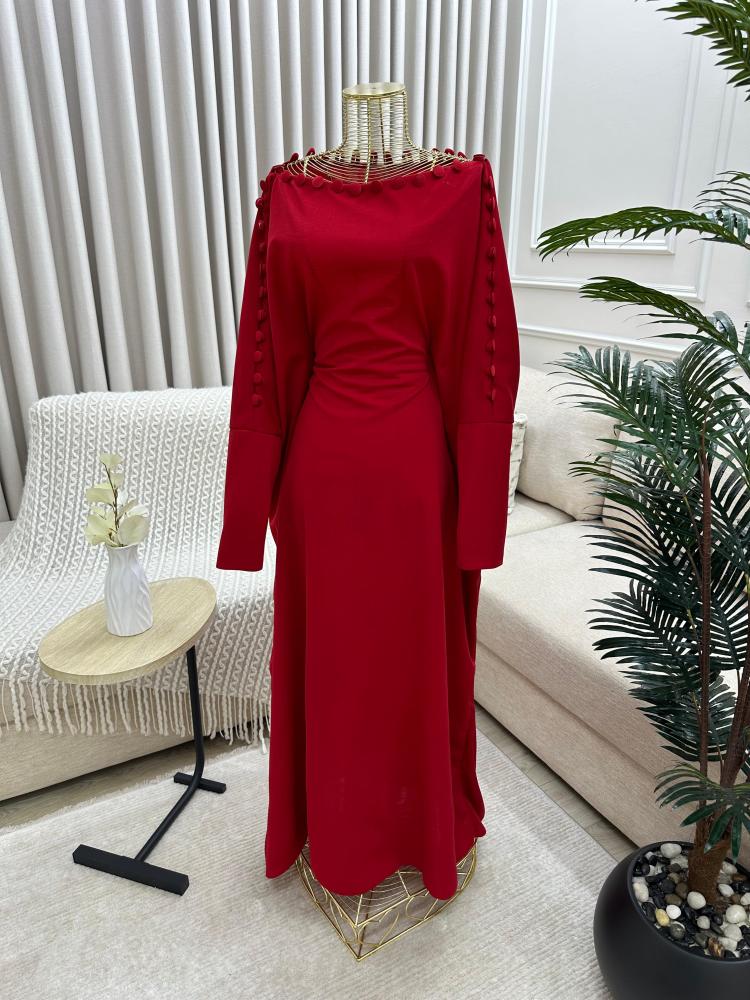 - الأكمام طويلة بنفس لون الفستان الأحمر، مما يضفي على التصميم طابعًا محتشمًا وأنيقًا.