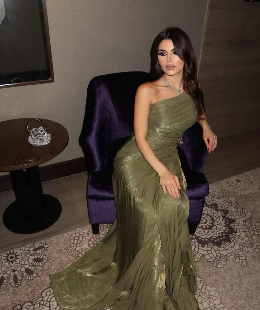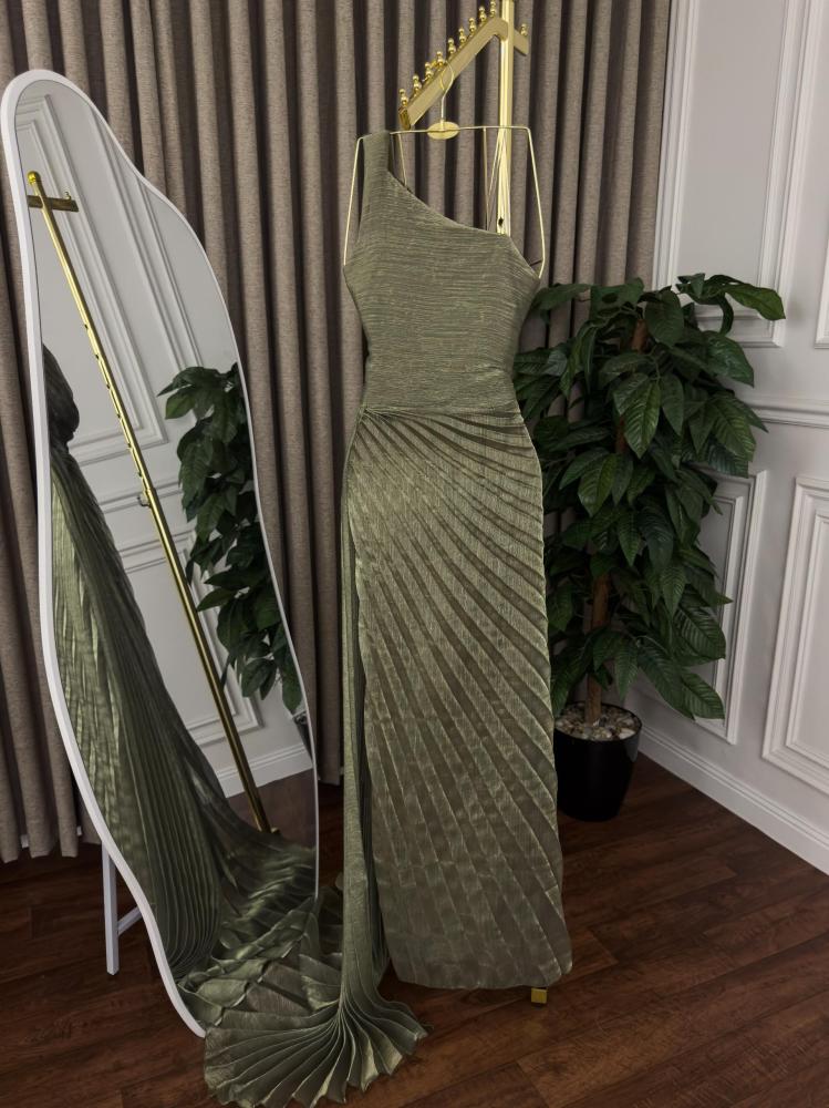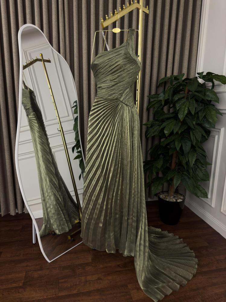 🔹 اللون: يتميز الفستان بلونه الأخضر الزيتوني الهادئ، وهو لون يعكس الرقي والأناقة ويضفي لمسة من الفخامة على الإطلالة.