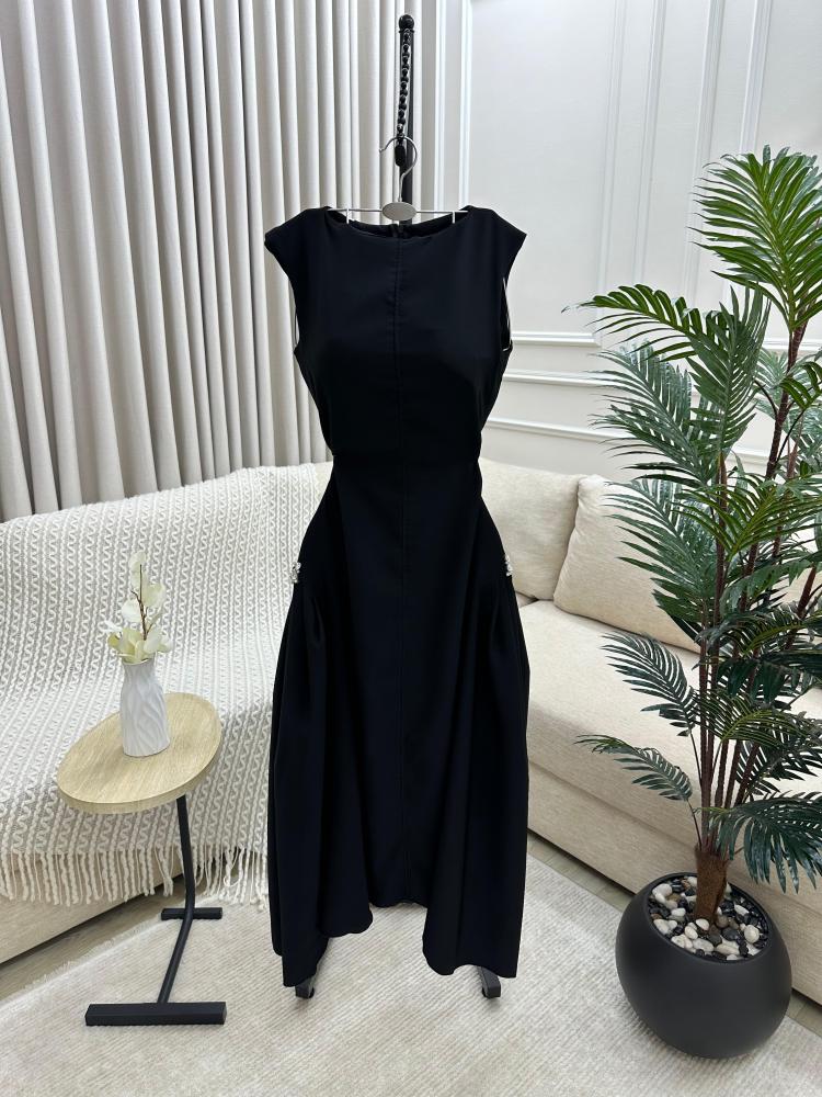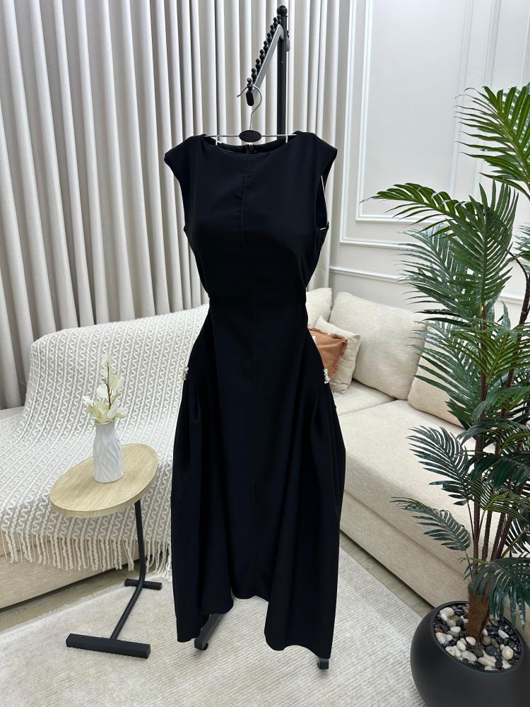 الفستان الظاهر في الصورة هو فستان أنيق باللون الأسود، يتميز بتصميم كلاسيكي راقٍ يناسب المناسبات الرسمية أو السهرات.