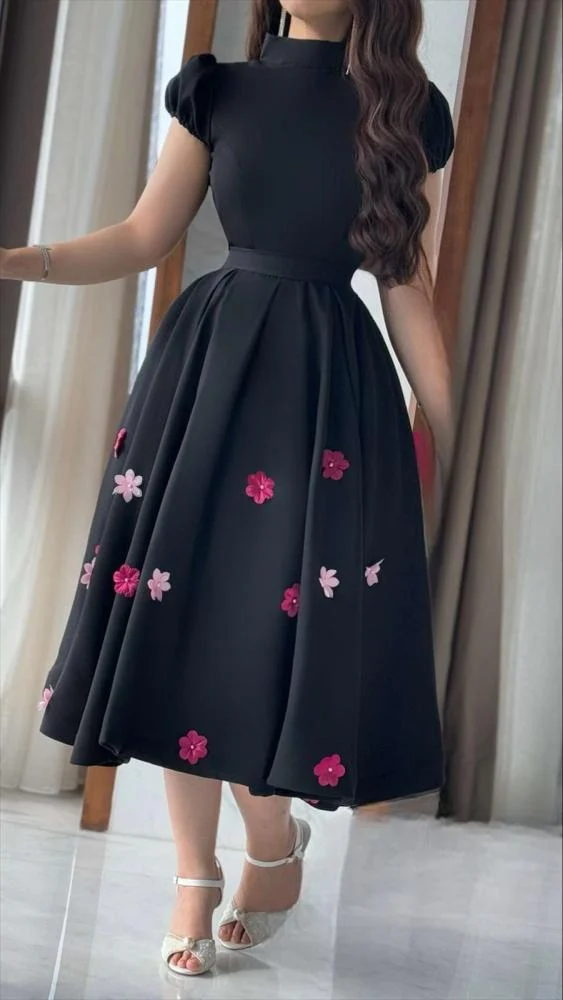 يأتي الفستان بأكمام قصيرة منفوشة قليلًا (puffed sleeves)، مما يضفي لمسة ناعمة ورقيقة تتناغم مع التصميم العام، وتضيف طابعًا أنثويًا رقيقًا يناسب مختلف الأذواق.