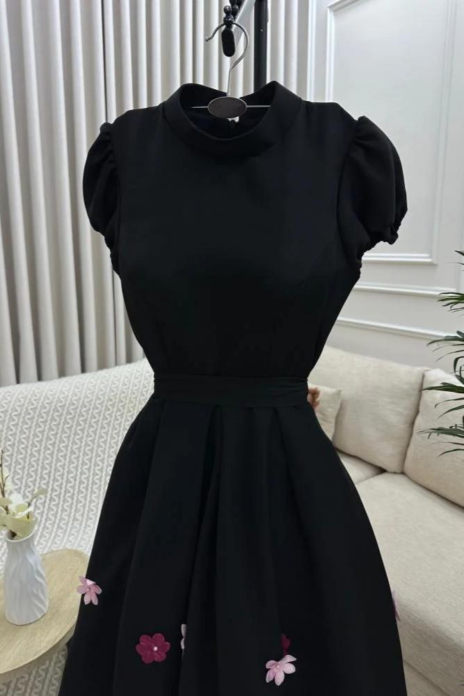 تم تزيين التنورة بورود صغيرة بارزة بألوان الوردي والزهري، منتشرة بتناغم على القماش الأسود، مما يخلق تباينًا جذابًا بين اللونين ويضفي لمسة من الحيوية والأناقة على الإطلالة.