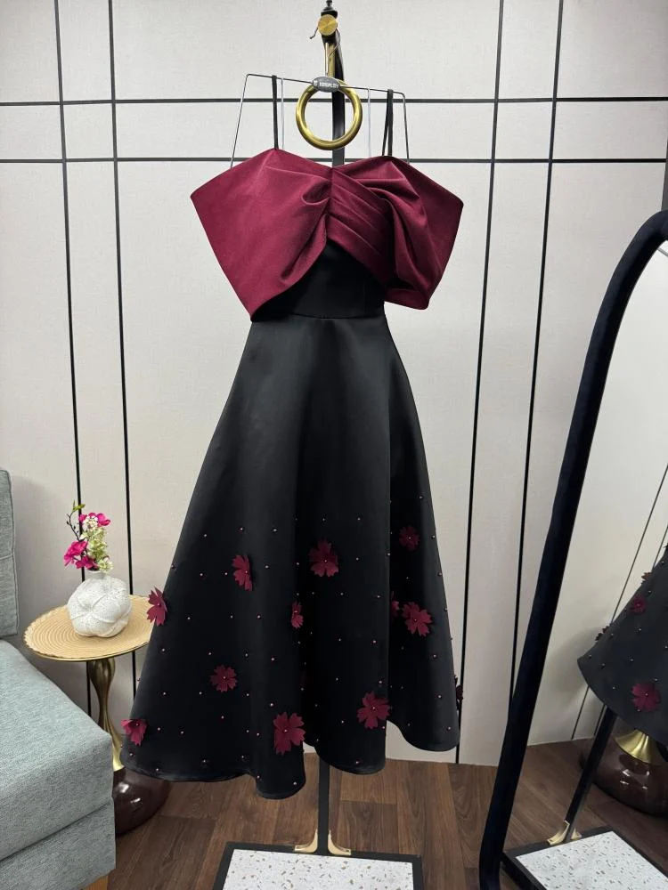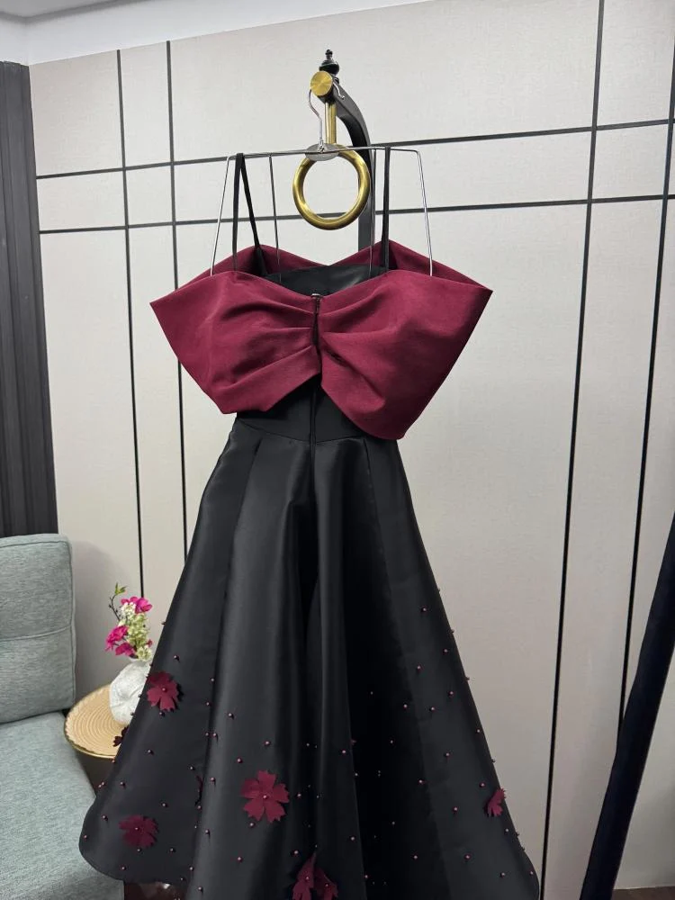 - تصميم أوف شولدر مع عقدة كبيرة باللون العنابي تعزز من جمال منطقة الكتف والصدر.