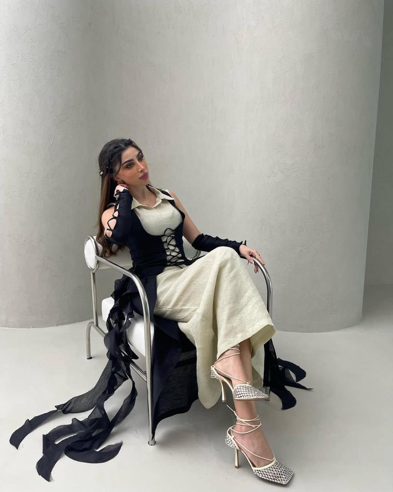 - الكورسيه: يأتي بتصميم مميز بأشرطة ربط متقاطعة في المنتصف تمتد من الصدر إلى الخصر، مما يمنح الفستان طابعاً مستوحى من الأزياء الفيكتورية القديمة مع لمسة عصرية جذابة.