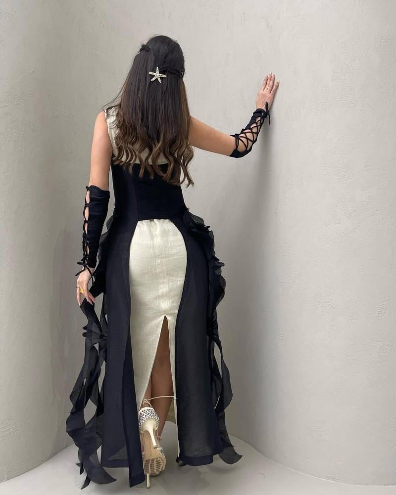 - الطبقات الجانبية: يمتد القماش الأسود من الخصر إلى الأسفل على شكل طبقات متدرجة ذات حواف غير منتظمة، مما يضفي حركة وانسيابية رائعة، ويعطي للفستان طابعاً درامياً يشبه المعاطف الفيكتورية الطويلة.