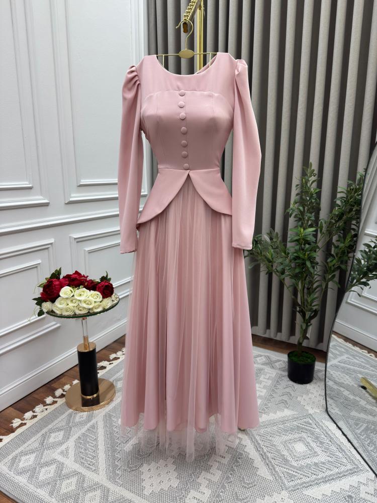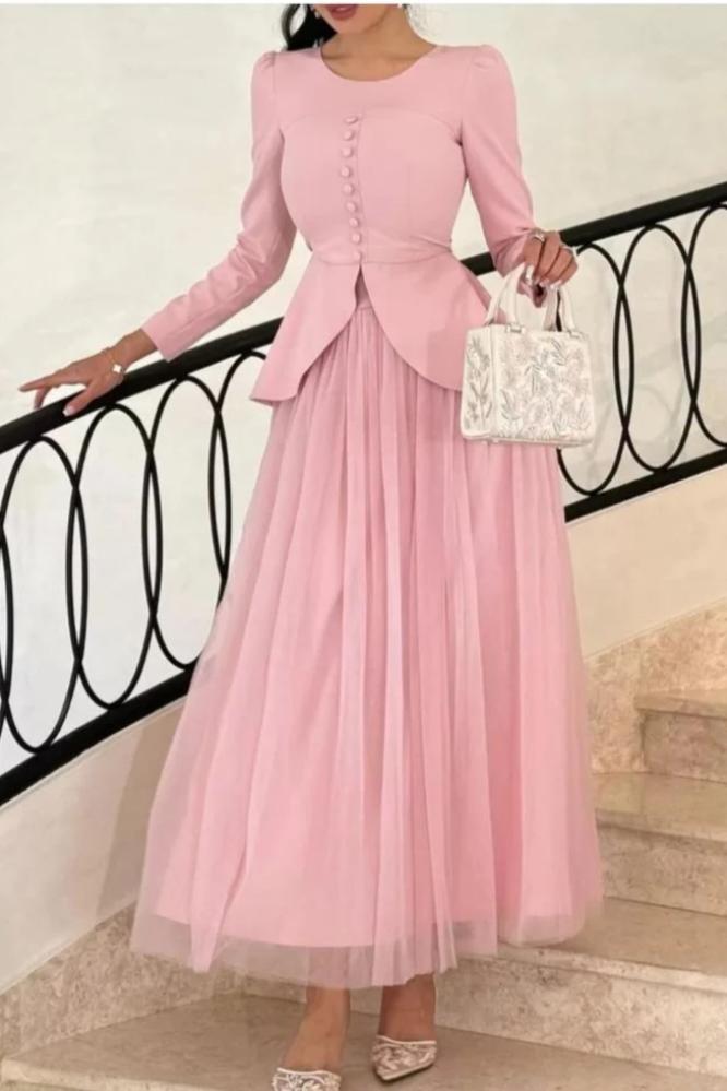 يتميز الفستان بتصميم أنثوي راقٍ، يجمع بين الكلاسيكية والعصرية في مزيج ساحر. يتكون من جزأين متصلين: الجزء العلوي المصمم بأسلوب بليزر أنيق مع أزرار أمامية، والجزء السفلي عبارة عن تنورة منفوشة من التول لمظهر فخم وجذاب.