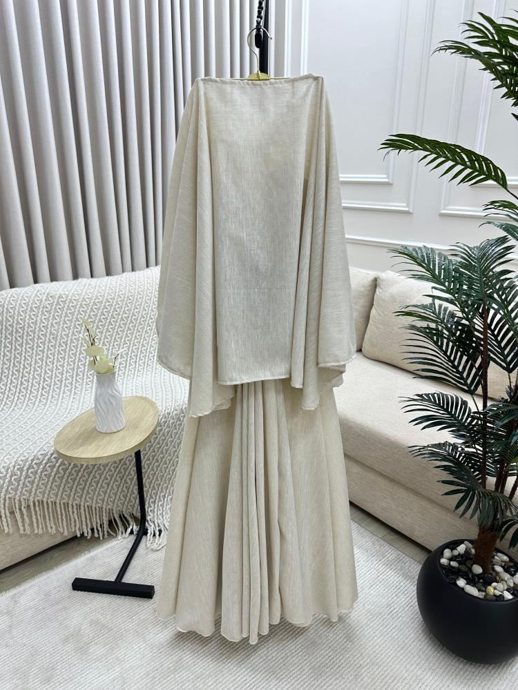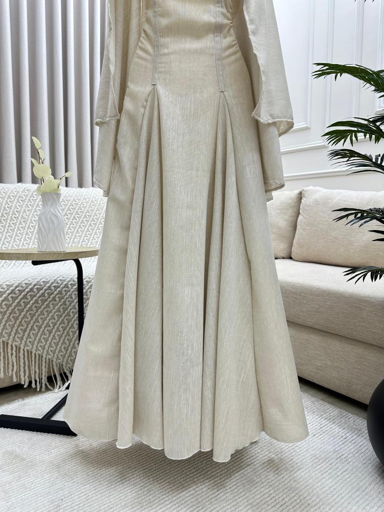 - تنورة طويلة واسعة بقصة الكلوش مع ثنيات ناعمة تبدأ من الخصر، ما يمنح انسيابية رائعة أثناء الحركة.
