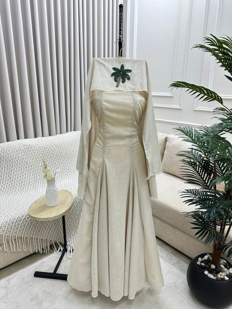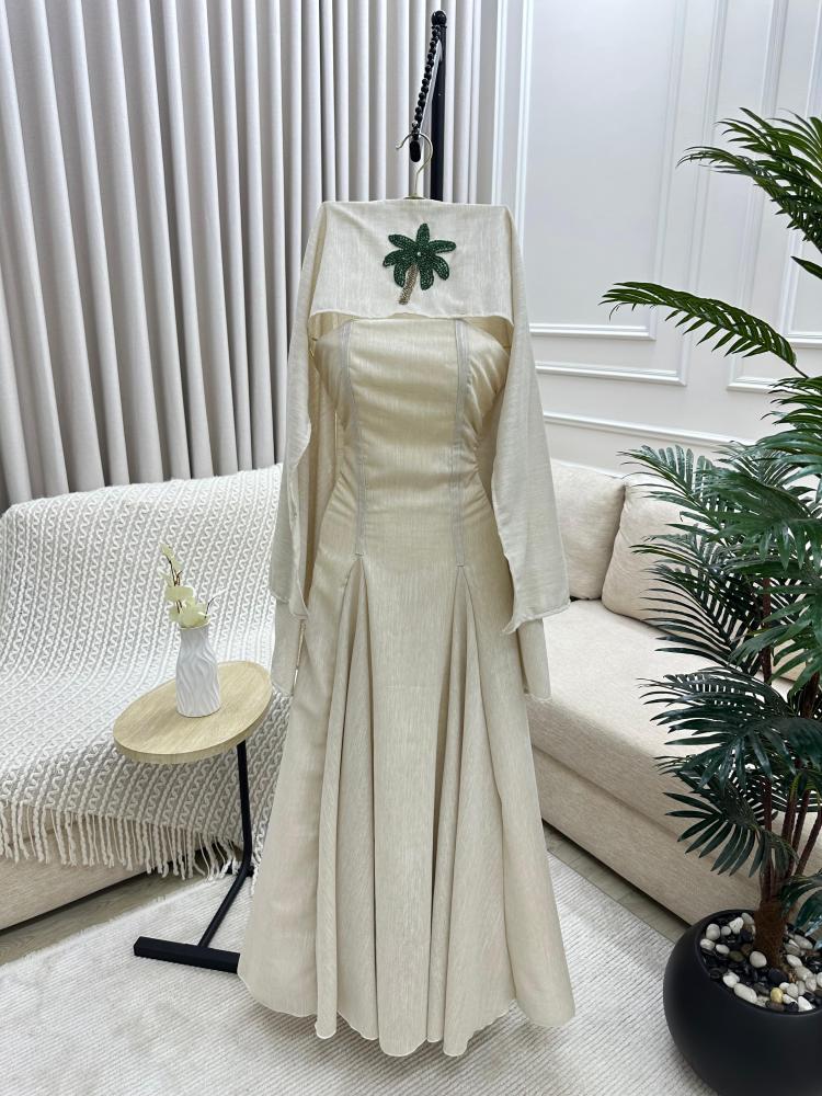 هذا الفستان الأنيق يجمع بين الرقي والفخامة في تصميم بسيط لكنه ينبض بالأناقة. بلونه البيج الناعم وخامته الفاخرة، يمنح إطلالة أنثوية راقية تناسب مختلف المناسبات.
