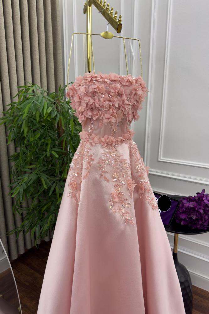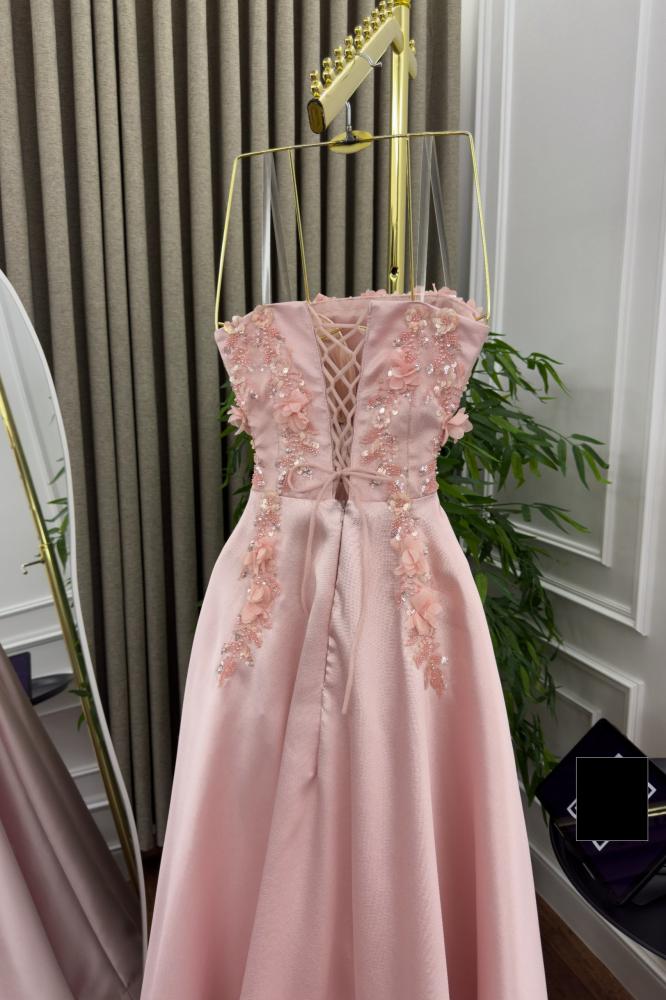 🔹 التطريز: تطريز مورد أنيق على الجزء العلوي يمتد تدريجيًا نحو التنورة، ليمنح الفستان مظهرًا فخمًا وكأنه مستوحى من حدائق الزهور الراقية.