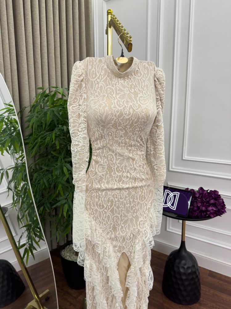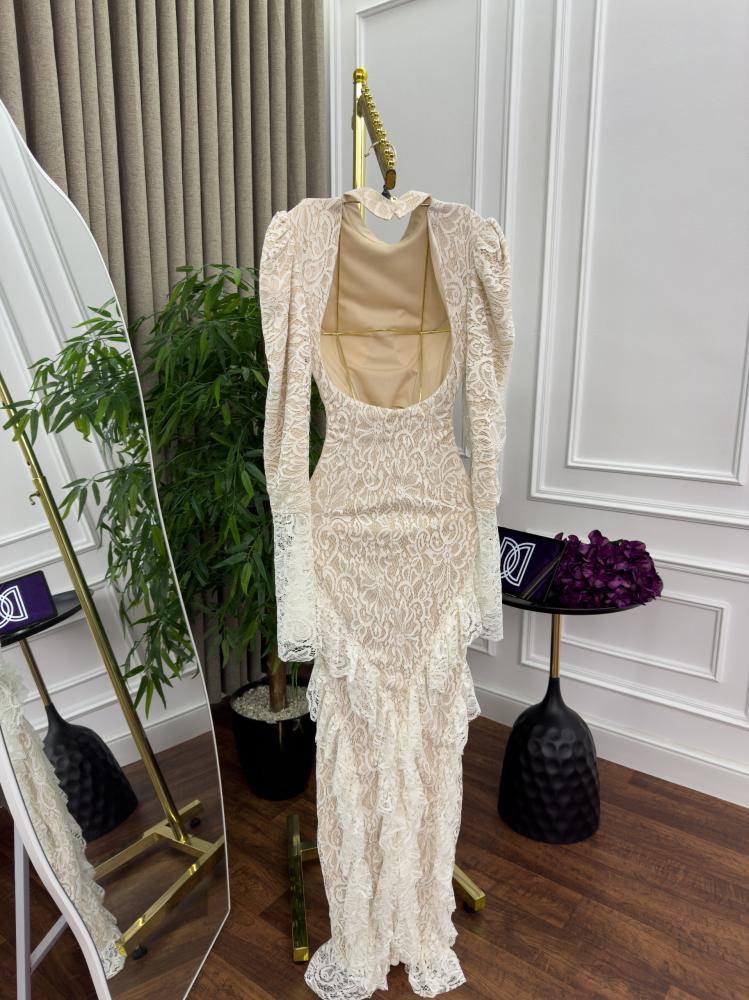 فستان سهره دانتيل أبيض كريمي بتصميم أنثوي فاخر ولمسات راقية