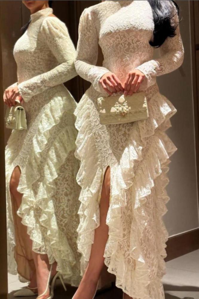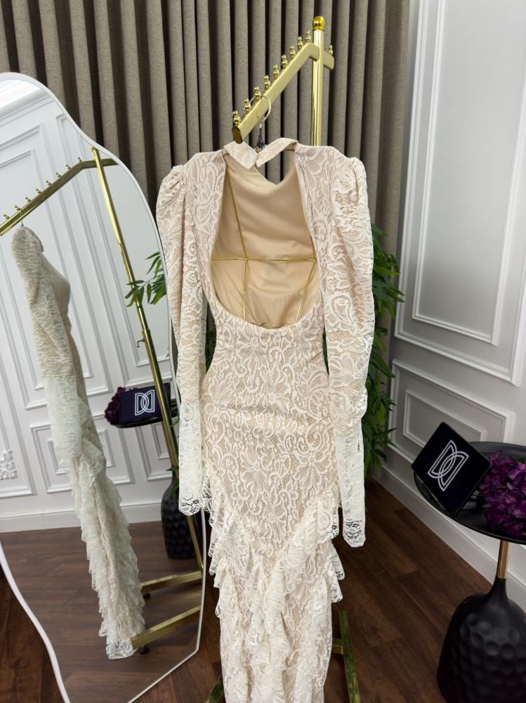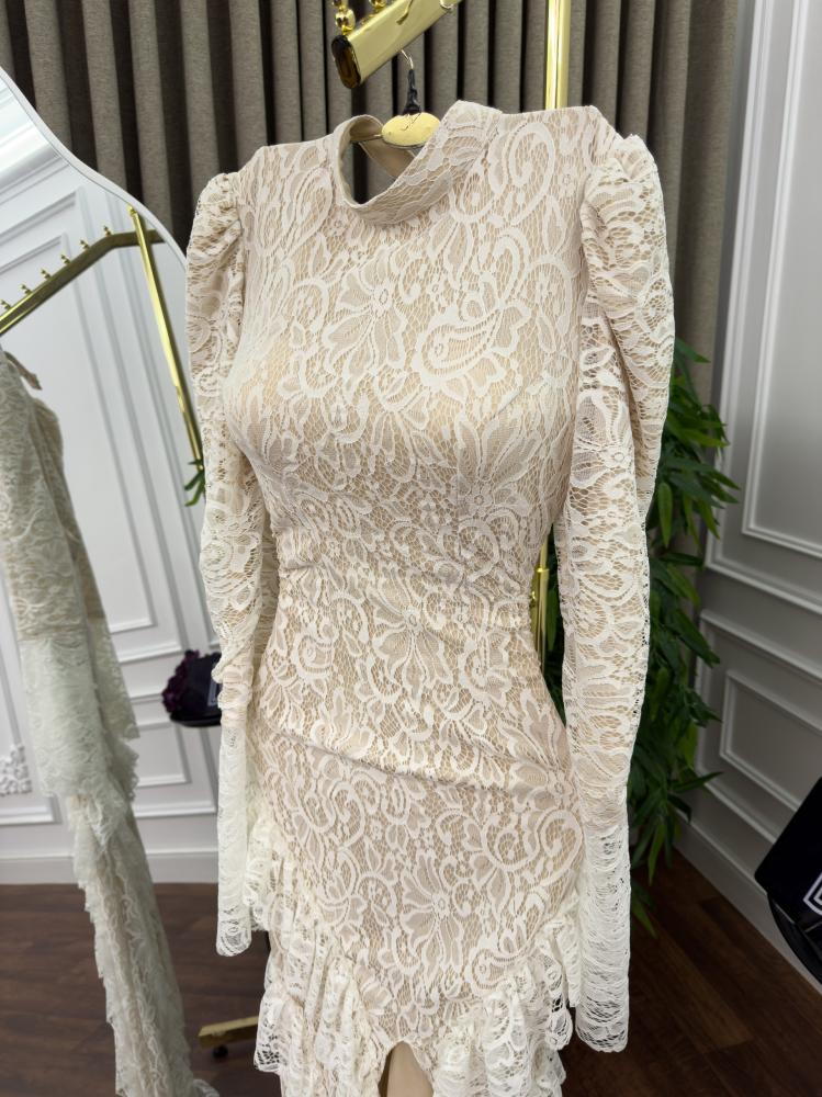 • الأكمام طويلة ومصنوعة بالكامل من الدانتيل الشفاف، مع ياقة عالية تضيف لمسة من الرقي الكلاسيكي.