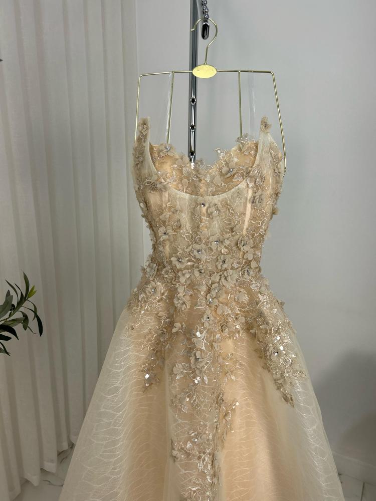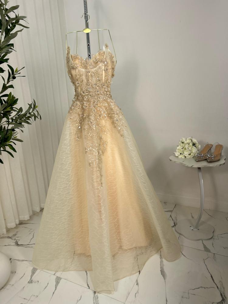 💫 فستان سهرة ملكي بلون ذهبي عاجي فاخر – تفاصيل أنثوية آسرة