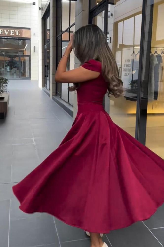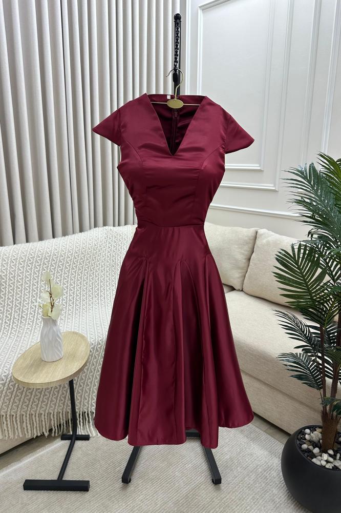 - الرقبة المفتوحة: الفستان يتميز بياقة على شكل حرف V تضفي لمسة أنثوية جذابة وتبرز الرقبة.