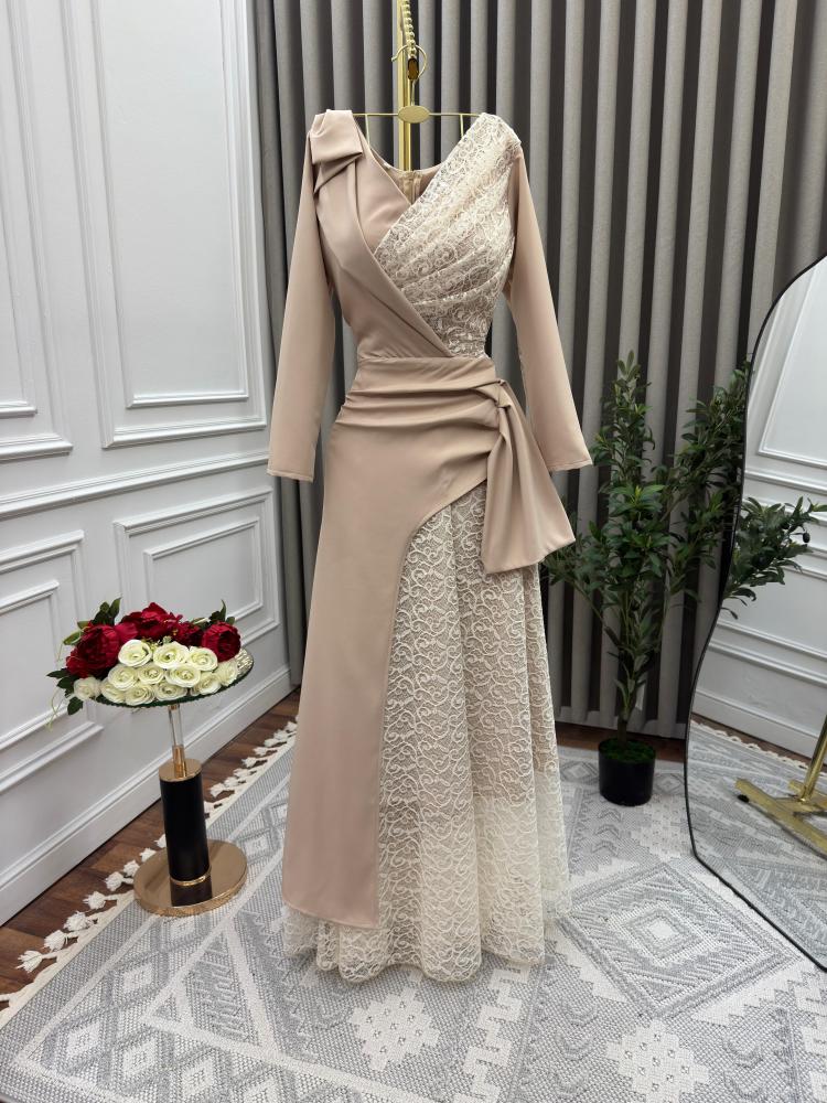 يتميز هذا الفستان بتصميم أنثوي فاخر يجمع بين الرقي والفخامة، حيث يجمع بين خامتي الباربي الناعمة والدانتيل الفخم، مما يمنحه مظهراً أنيقاً ومميزاً. يتميز بقصة تحدد الخصر وتبرز أنوثة القوام، مع لمسات راقية تعزز من جاذبيته.