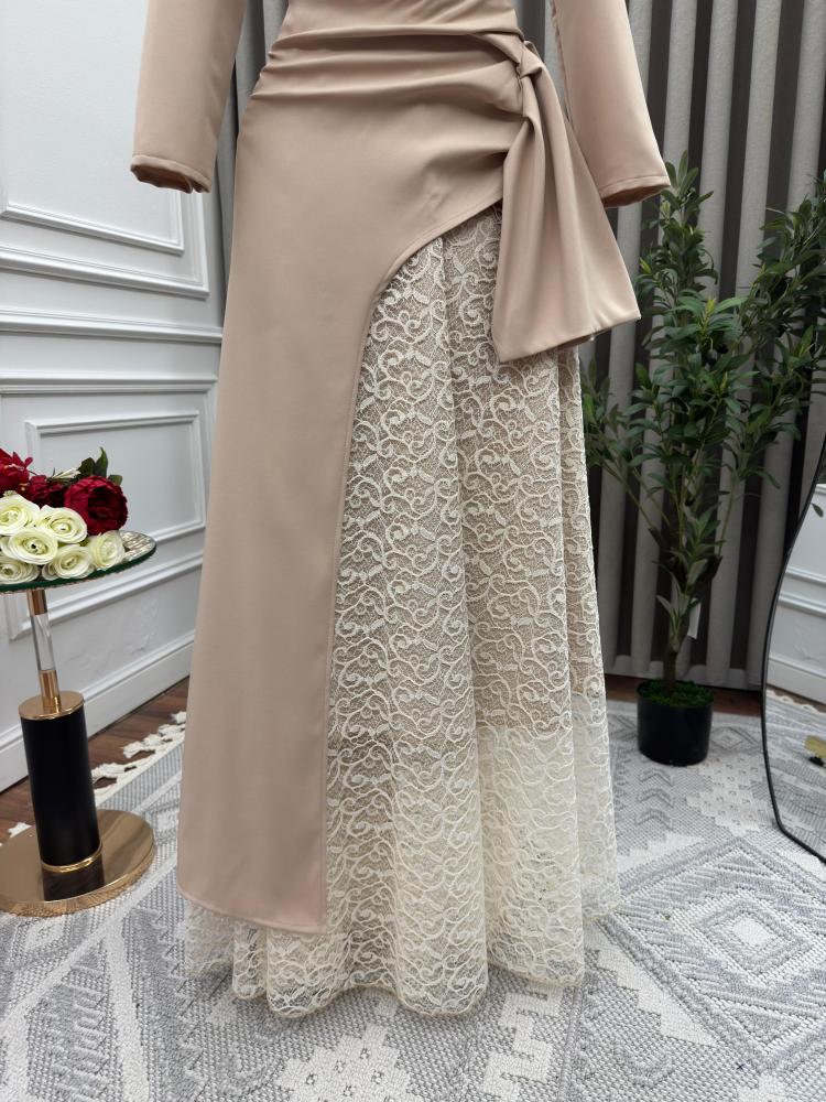 - الدانتيل الفاخر: يغطي الجزء السفلي من الفستان، وهو مصنوع من تطريزات ناعمة بنقوش أنثوية راقية تضفي لمسة رومانسية ساحرة.