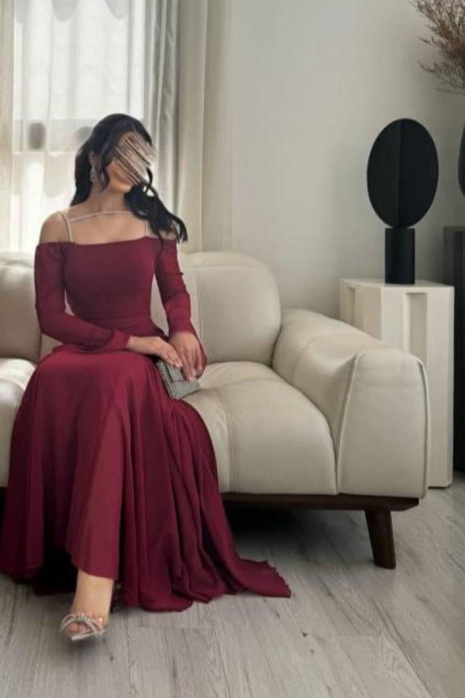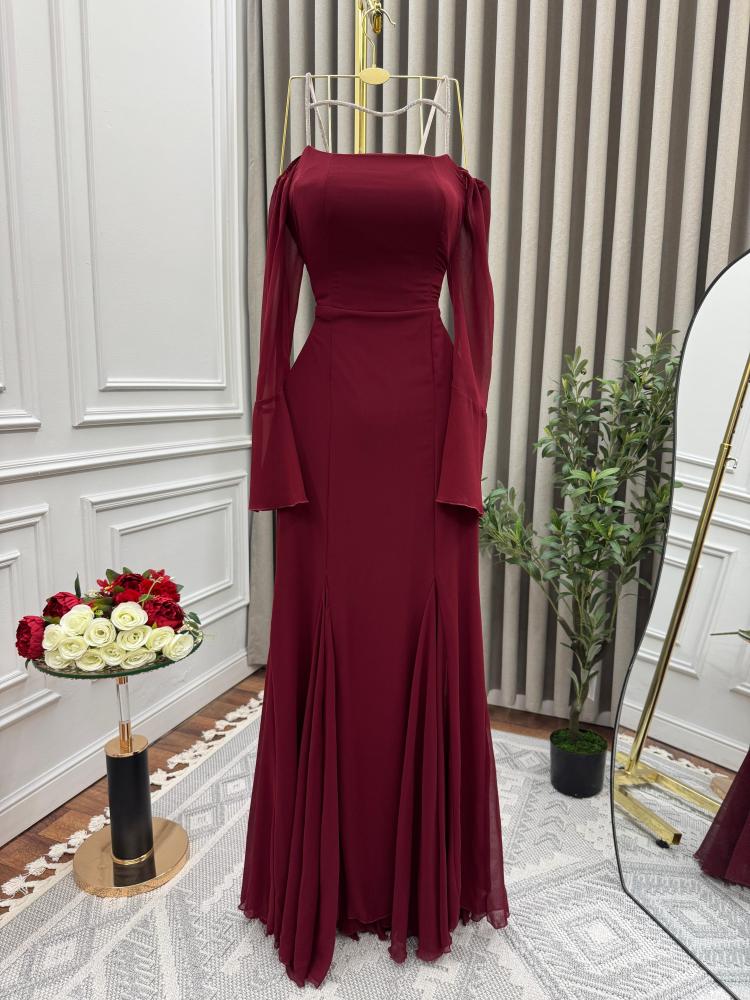 - أكمام طويلة بتصميم شفاف من الشيفون الناعم تضيف لمسة حالمة.