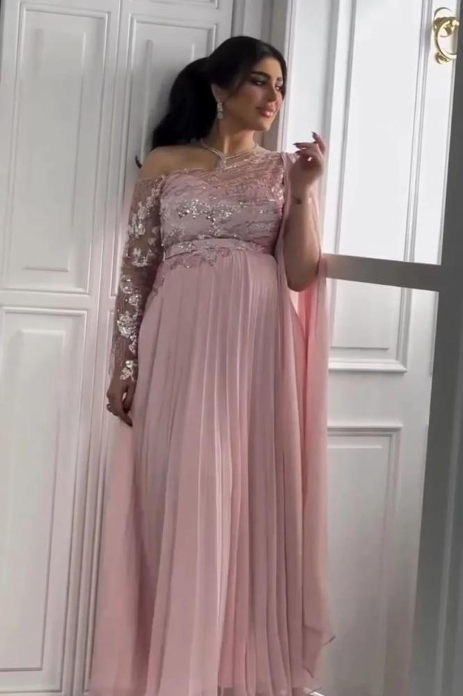 فستان سهرة أنثوي ناعم بلون وردي فاتح – تصميم بكتف واحد مناسب للحوامل