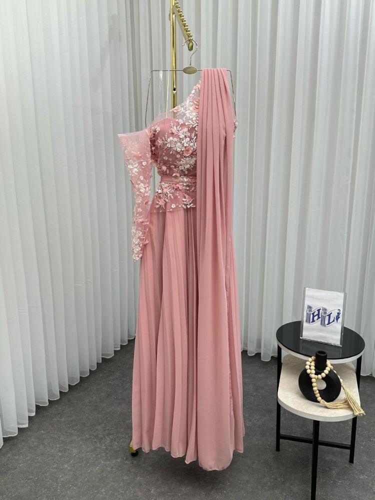اختاري الأناقة الهادئة والفخامة الناعمة مع هذا الفستان المصمم بعناية ليناسب ذوق المرأة الراقية، خاصةً في فترة الحمل. فستان بلون وردي فاتح أنثوي بكتف واحد، مصنوع من قماش الجورجيت الناعم مع تطريز دقيق من الترتر والورود البارزة ليمنحك حضورًا راقيًا دون التضحية بالراحة.