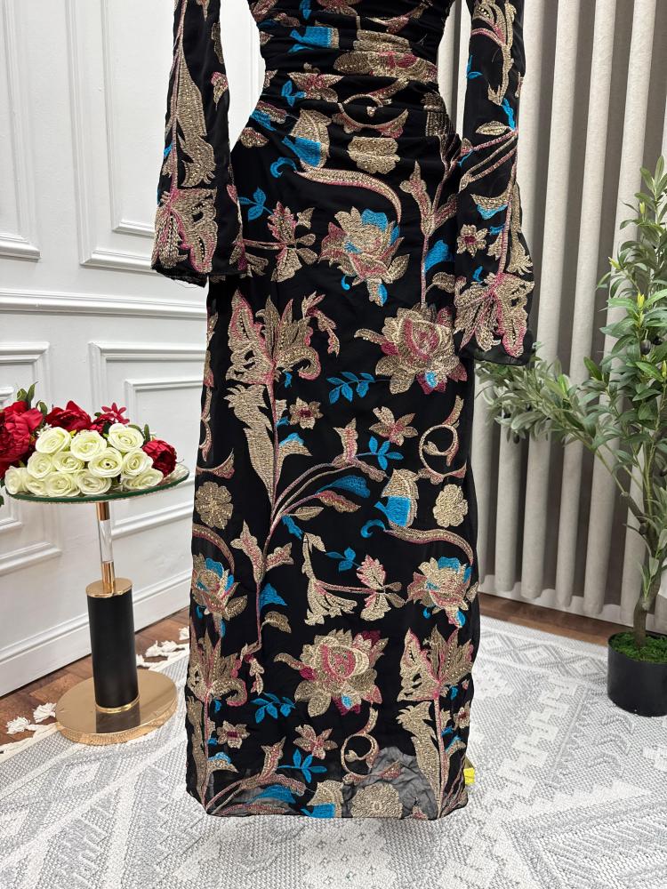 - القماش: مخمل أسود ناعم الملمس مزين بتطريزات زهرية فاخرة بألوان أنيقة.