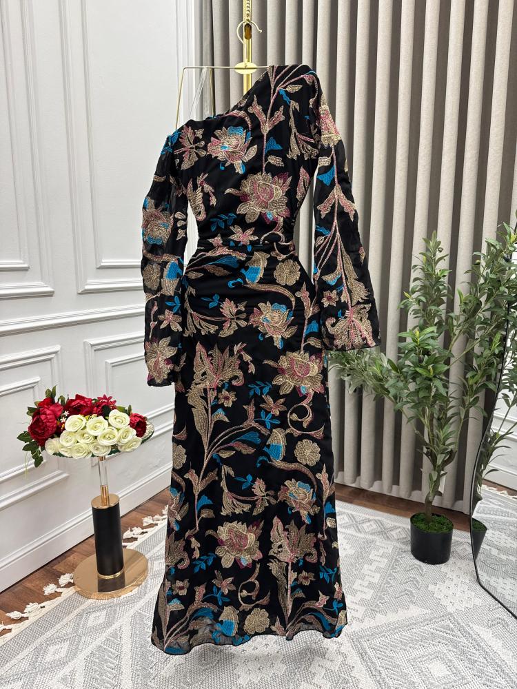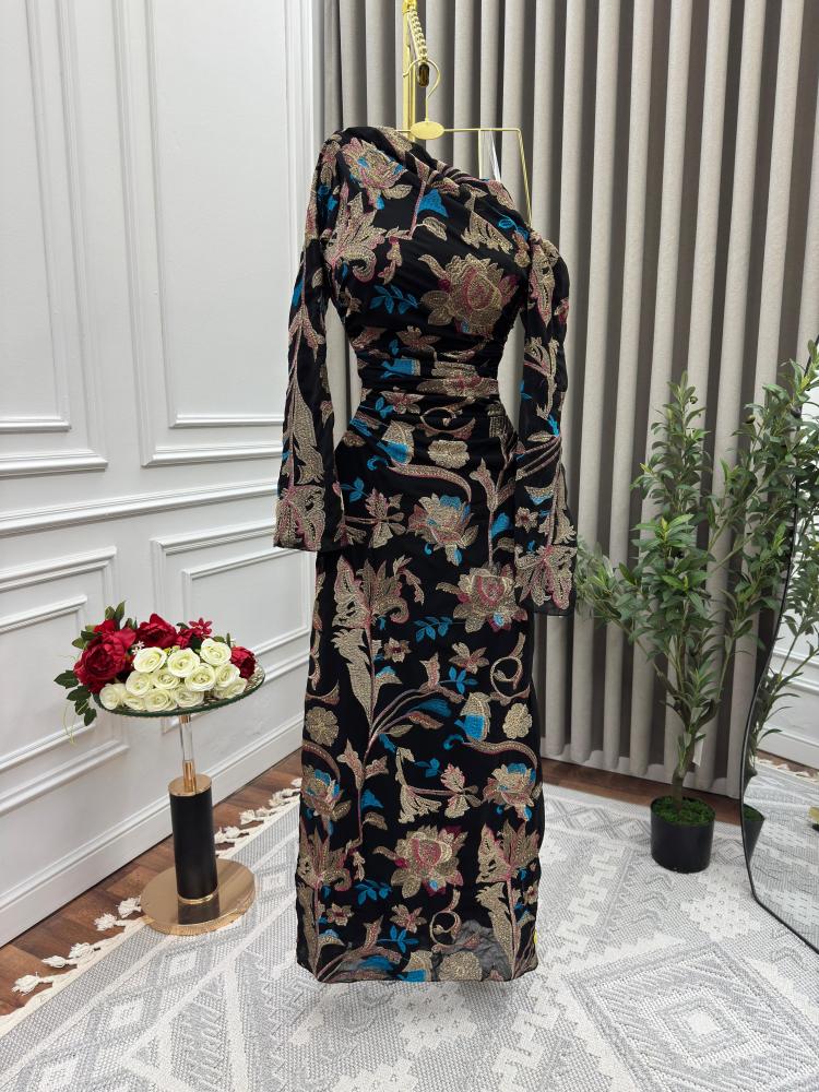 يتميز هذا الفستان الفاخر بتصميمه الجذاب المصنوع من قماش المخمل الأسود الفاخر، الذي يضفي لمسة من الفخامة والرقي. يزدان الفستان بتطريز فاخر من الورود والنقوش الذهبية المتناثرة بدقة على طول القماش، مما يمنحه طابعًا ملكيًا راقيًا.