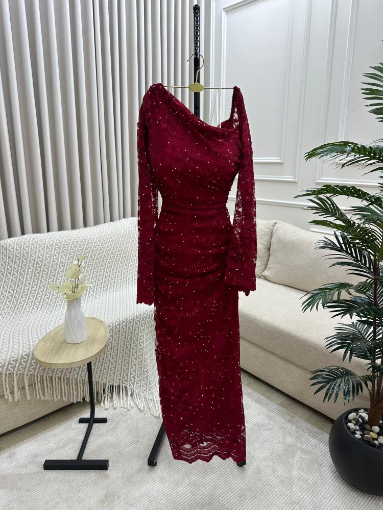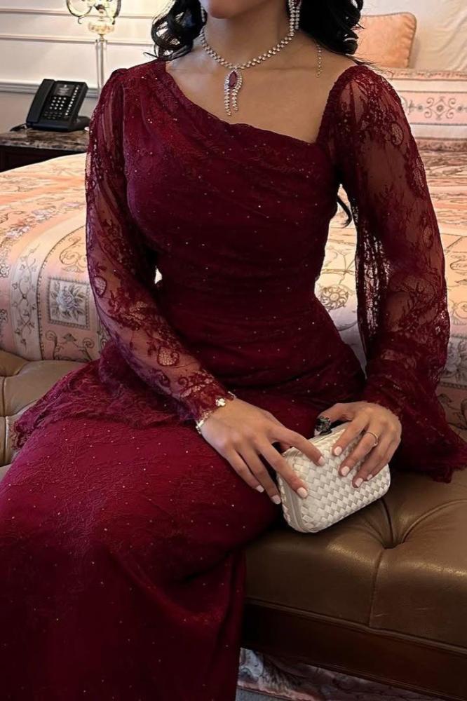 - أكمام طويلة مصنوعة بالكامل من الدانتيل الشفاف، مما يمنح الفستان لمسة راقية وساحرة.