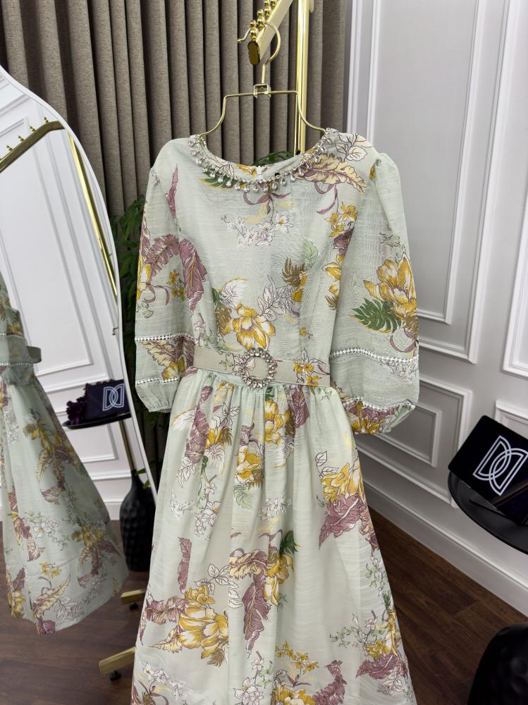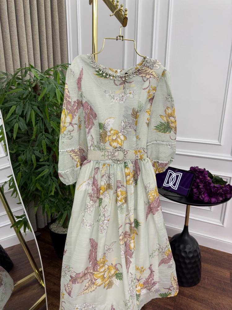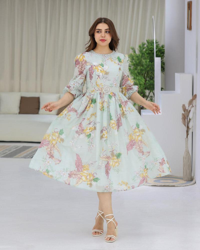 - اللون: خلفية باللون الأخضر الفاتح الهادئ مع نقوش زهرية بألوان متعددة مثل الأصفر والوردي والبنفسجي، مما يضفي لمسة أنثوية وجاذبية على الإطلالة.