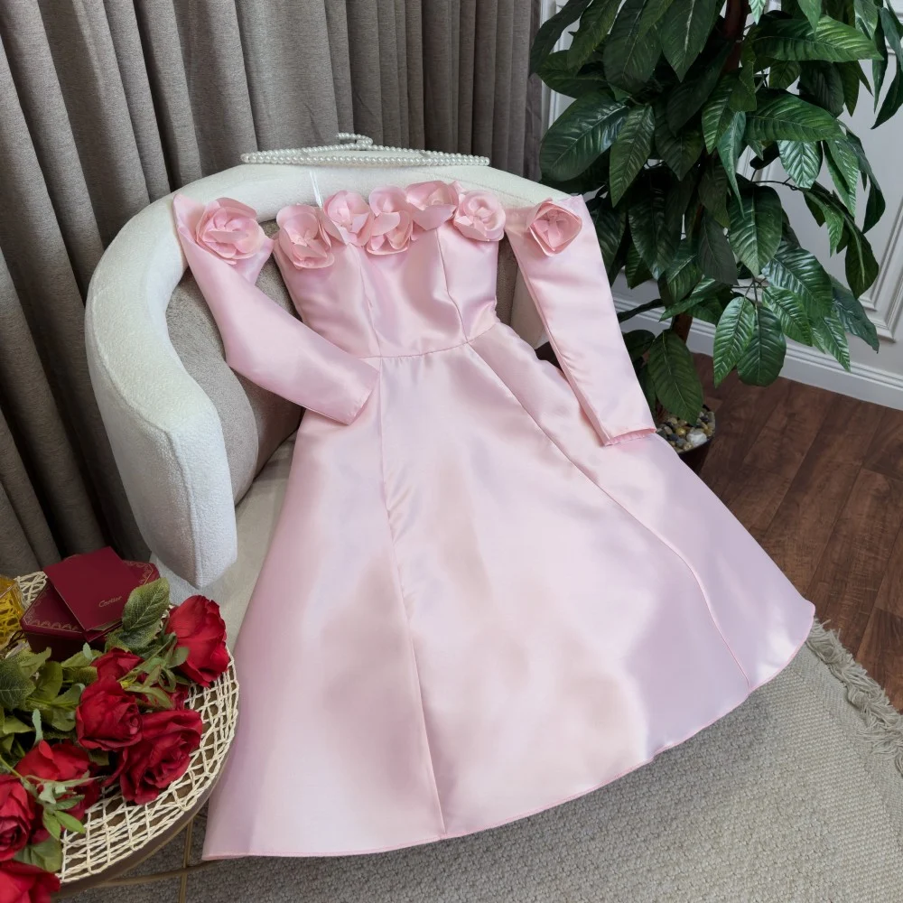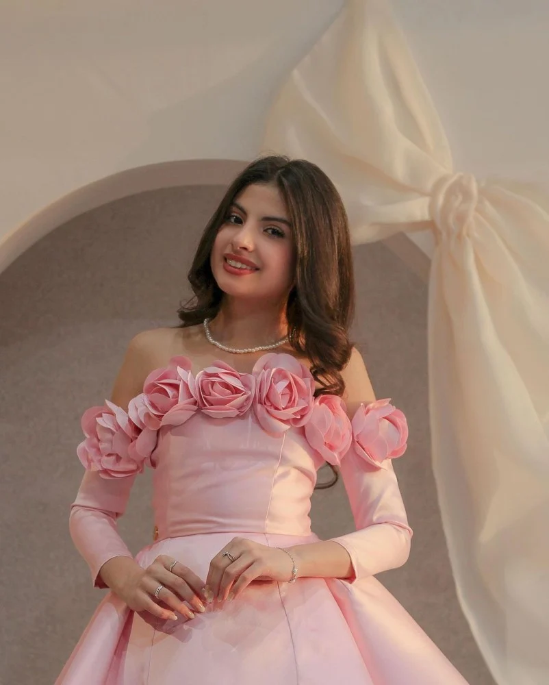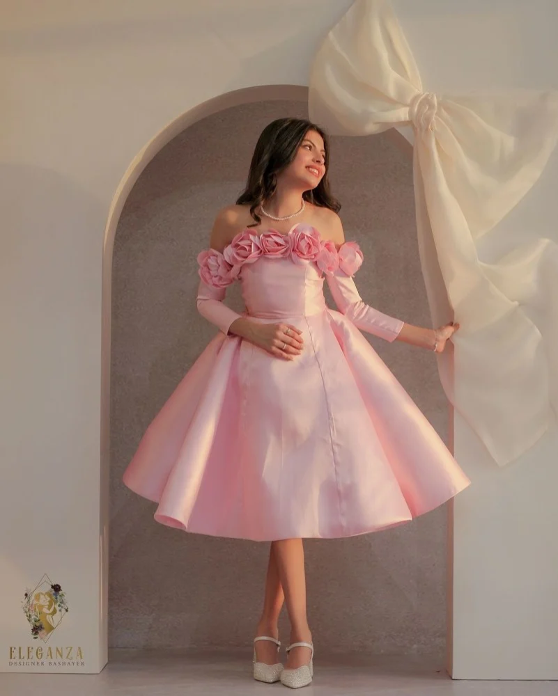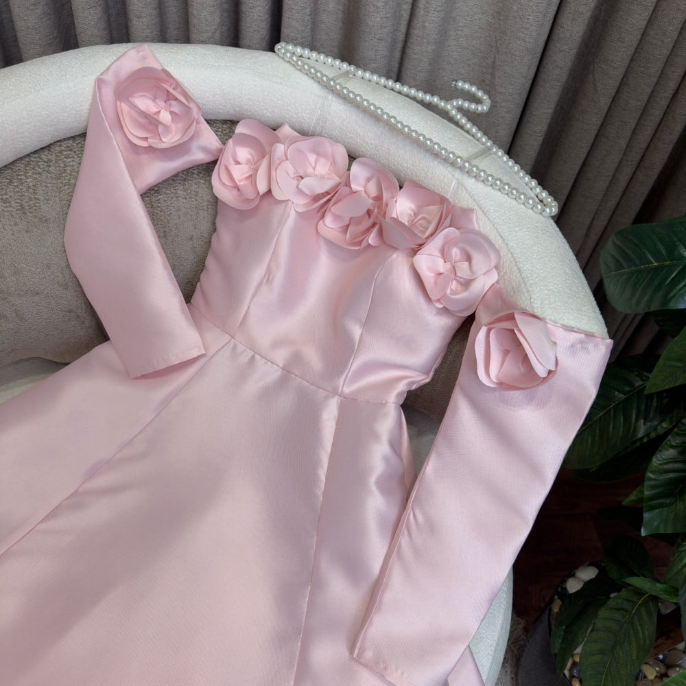 ما يميز الفستان هو الورود الوردية ثلاثية الأبعاد التي تزين الصدر والأكمام، مما يضفي لمسة رومانسية ساحرة.