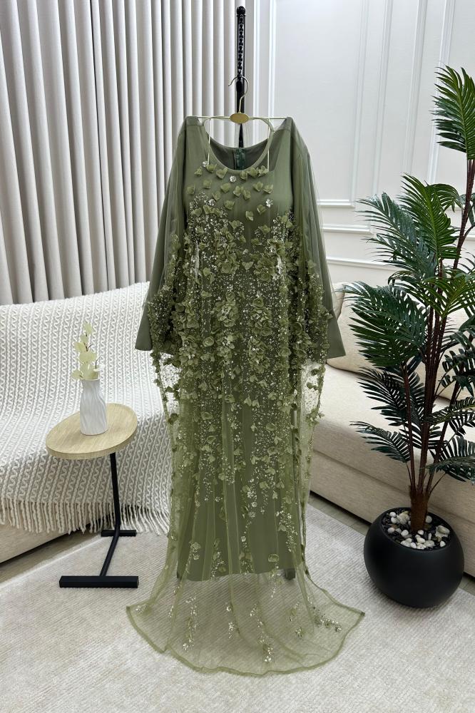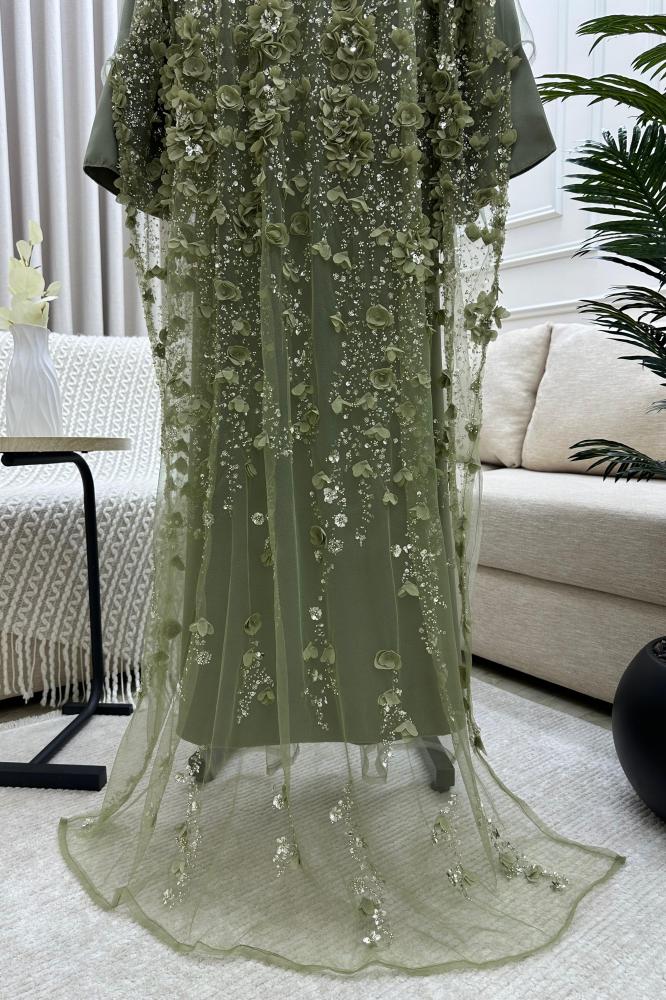 - القفطان مصنوع من قماش شفاف مع طبقة داخلية غير شفافة باللون الزيتوني (Olive Green) لإبراز فخامة التصميم.